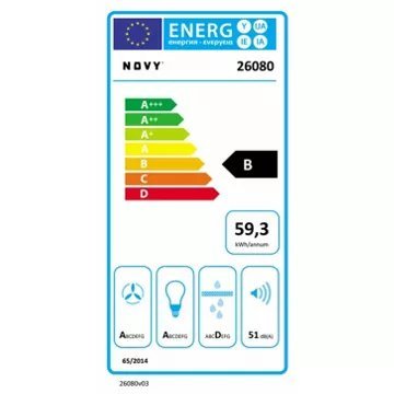 La hotte encastrable NOVY CRYSTAL 26080 se distingue par son esthétique épurée et sa finition en verre blanc, s’intégrant parfaitement dans les cuisines modernes. Avec une largeur de 90 cm, elle s’adapte aisément au-dessus de votre plan de cuisson. Côté performance, cette hotte est classée B en efficacité énergétique, garantissant une consommation maîtrisée de 59,3 kWh/an. Elle bénéficie également d’une classe A en efficacité fluidodynamique et lumineuse, offrant un éclairage Led strip de 14 W pour une visibilité optimale sans excès de consommation.